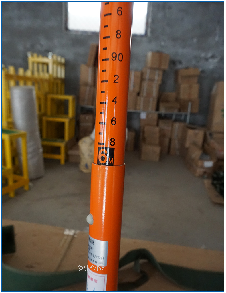 4、測(cè)量時(shí),由內(nèi)層絕緣桿向上抽起,每根絕緣桿的刻度對(duì)應(yīng)外面一層絕緣桿的尺寸刻度,然后旋緊絕緣桿,測(cè)高桿的金屬掛鉤掛在高壓線路上,此時(shí)外側(cè)的絕緣桿上沿對(duì)齊抽起的絕緣桿的刻度;