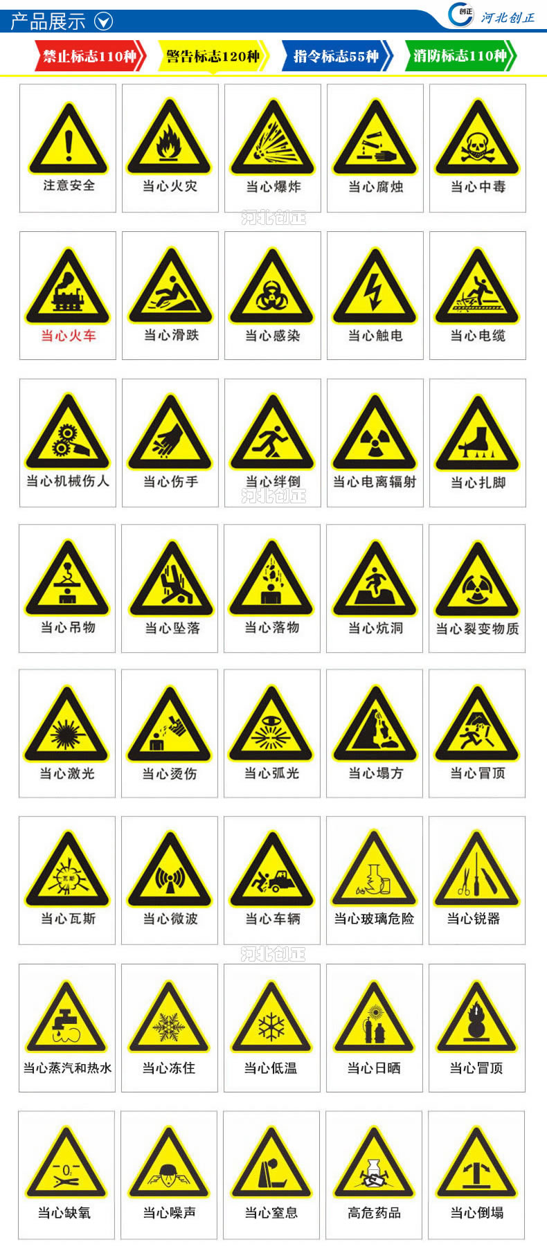 2、產(chǎn)品內(nèi)容:禁止、指令、提示、線路相位、消防、通信、交通等。